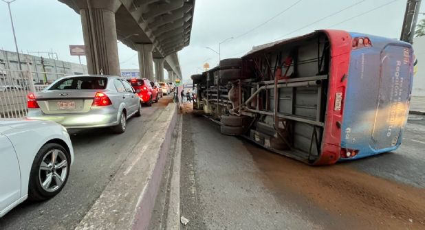 Guadalupe.- Un camión urbano volcó la mañana de este lunes 16 de diciembre en el municipio de Guadalupe, dejando al menos a 9 personas lesionadas.