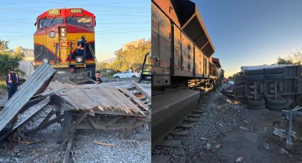 Guadalupe.- Un tren impactó y partió una de las cajas de un tráiler que intentó ganarle el paso, en el municipio de Guadalupe.