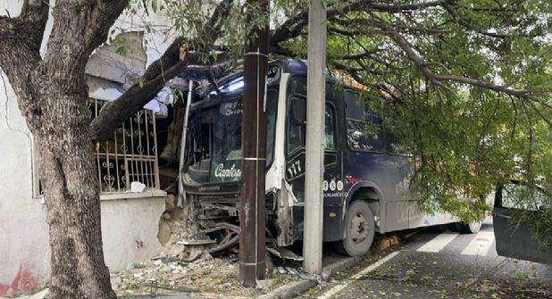 Monterrey. - Al no respetar el alto un conductor provocó que un camión urbano se impactara contra la fachada de una vivienda en el Centro de Monterrey.