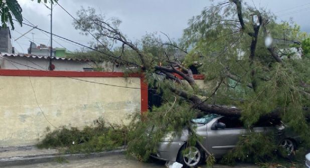 Monterrey.- Las lluvias y el viento provocaron la caída de un árbol, que dañó un auto estacionado y la entrada de una vivienda la mañana de este jueves, durante el segundo día de precipitaciones en la entidad.