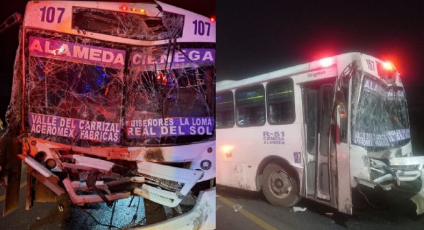 Ciénega de Flores.- Un choque entre un camión urbano de la ruta 51, un autobús de transporte de personal, un tráiler y una motocicleta colapsó la vialidad en la entrada al municipio de Ciénega de Flores.