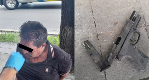 Tras la revisión precautoria en sus pertenencias, se encontró un arma de fuego tipo escuadra de calibre 9 milímetros, artefacto con el cual testigos señalan que amenazó a la responsable del establecimiento afectado.