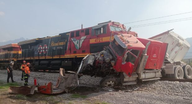 Elementos de Protección Civil de Nuevo León acudieron al sitio después de recibir el reporte de un accidente ferroviario, donde el tren tuvo que frenar el paso tras impactarse con el camión de carga pesada.