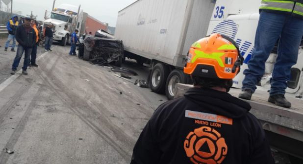 A las 14:46 horas se recibió el reporte de un accidente entre 10 vehículos, incluidos cinco unidades de carga pesada, cuatro camionetas y un automóvil, dejó bloqueado el tráfico en el Libramiento Noroeste, en García, a la altura de la pedrera Incasa, en el tramo comprendido entre la avenida Luis Donaldo Colosio y Lincoln.