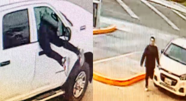En la grabación se puede observar a un sujeto con vestimenta en color negro y tenis blancos, quien tras el cristalazo ingresa por lo menos la mitad de su cuerpo a la unidad para lograr alcanzar una mochila en la que aparentemente se encontraba el arma, y tras sustraerla, este se retira caminando del sitio.