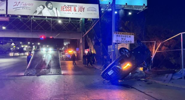 Tras el impacto, el vehículo compacto sufrió una volcadura que le llevó a impactarse contra un poste de concreto derribando a su vez diferentes señalamientos, así como parte de un muro de malla.