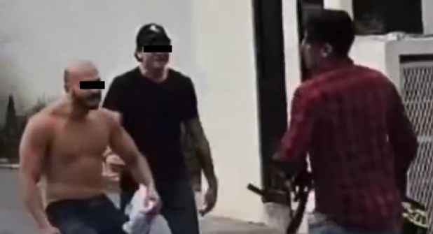 En las imágenes captadas se aprecia a estos hombres, uno calvo sin camiseta que sería Alejandro Gamboa, y otro de playera y gorra color negra llamado Jorge Gamboa, amedrentando al trabajador y una persona que intentó defenderlo.