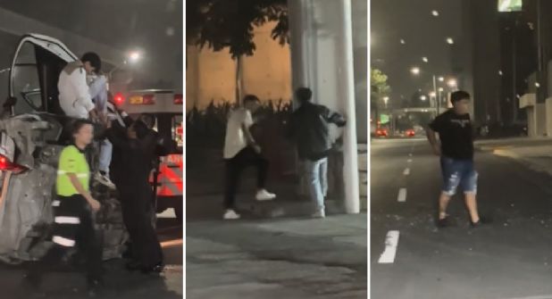 Monterrey. – Dos hombres que circulaban por avenida Constitución registraron con su teléfono celular cómo al menos cinco jóvenes salieron desde dentro de un auto que recién había sufrido una volcadura.