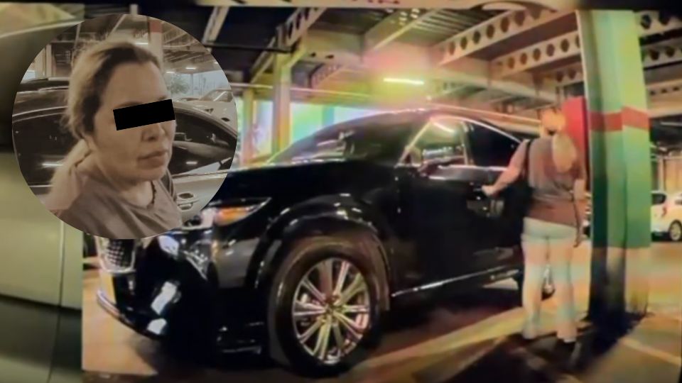 En el video se aprecia que la mujer que vestía pantalón blanco y camiseta gris, se acerca lentamente a una camioneta color negra que estaba dentro del estacionamiento.