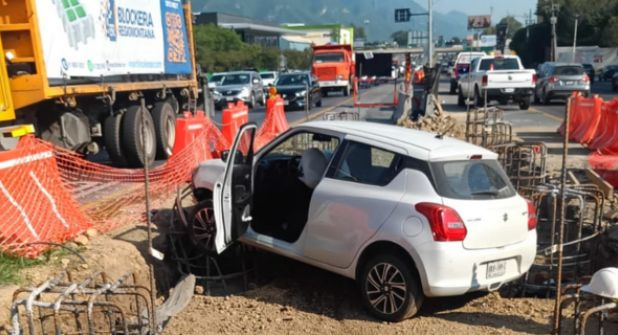 De acuerdo con fotografías difundidas por Protección Civil de Monterrey, el auto quedó entre la tierra y las varillas de la obra y se impactó de frente con unas varillas que había en el lugar.