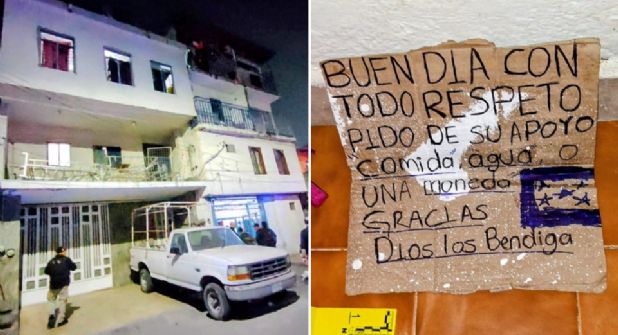 - Un fragmento de cartón con la leyenda: “Buen día, con todo respeto pido de su apoyo comida, agua o una moneda. Gracias. Dios los bendiga”.