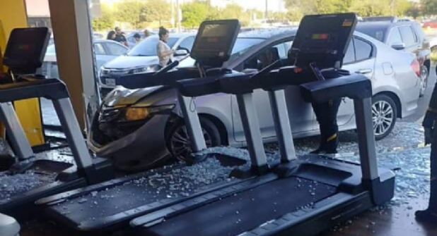 Producto del impacto, la estructura de vidrio quedó completamente destruida y el vehículo en cuestión a pocos centímetros de las caminadoras del inmueble.