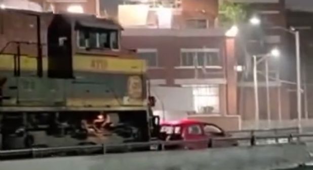 Monterrey. – Un vehículo que intentó cruzar las vías del tren fue arrollado por la locomotora esta madrugada de lunes en la avenida Fleteros, en el municipio de Monterrey.