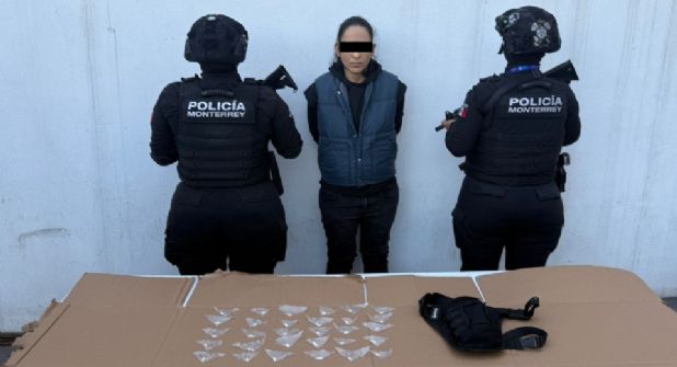 Monterrey.- Una mujer de 43 años fue detenida por elementos de la Policía de Monterrey en el centro de la ciudad, luego de que presuntamente le aseguraran 30 envoltorios con una sustancia sólida con características similares a la cocaína en piedra, durante un operativo de vigilancia.