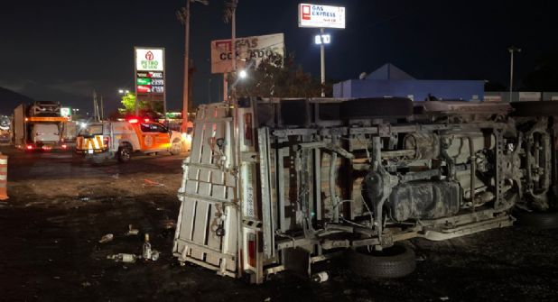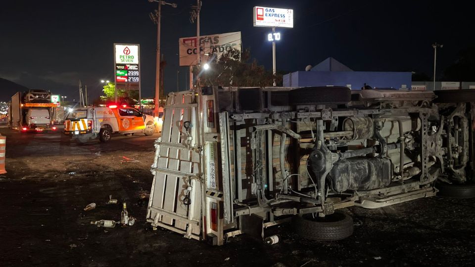 Santa Catarina. – Una camioneta que transportaba cerveza sufrió una volcadura la noche del lunes 22 de diciembre en la carretera Monterrey-Saltillo.