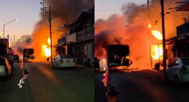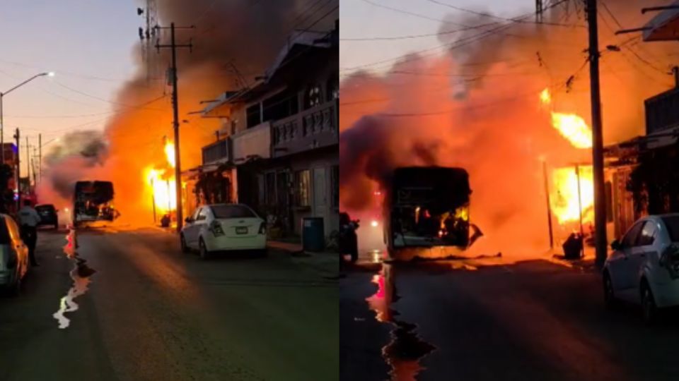 Apodaca.- Un camión que fungía como transporte de personal quedó envuelto en llamas la tarde de este lunes en calles de la colonia Cosmópolis, en Apodaca.