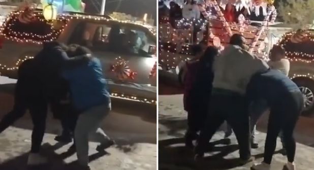 A pocos centímetros de la riña se encontraba una camioneta con flete, ambos decorados con luces y pinos navideños.