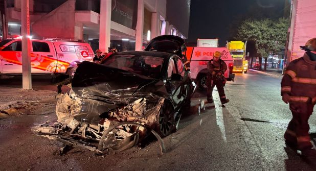 Trailero huye tras chocar contra un auto Tesla en Monterrey