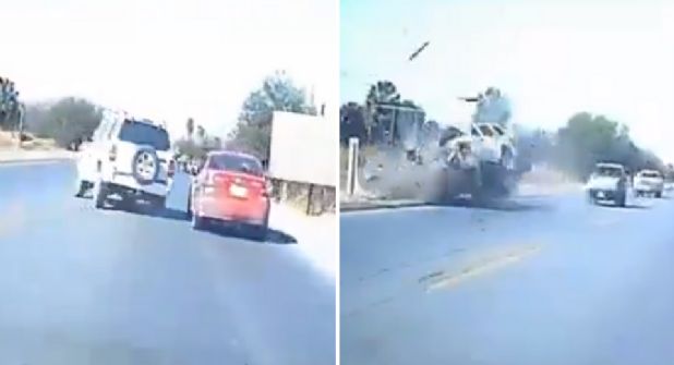 El hecho quedó captado en video, mismo que fue capturado por una pareja que viajaba en un vehículo que fue rebasado por la camioneta Liberty, la cual, se aprecia, dio un abrupto movimiento a la izquierda que la hizo impactarse de lleno contra la camioneta roja.