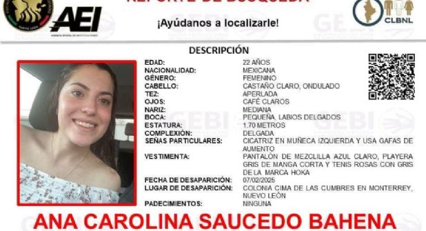 Monterrey.- Las autoridades y la comunidad de Monterrey solicitan el apoyo ciudadano para localizar a Ana Carolina Saucedo Bahena, una joven de 22 años que desapareció recientemente en la colonia Cima de las Cumbres.