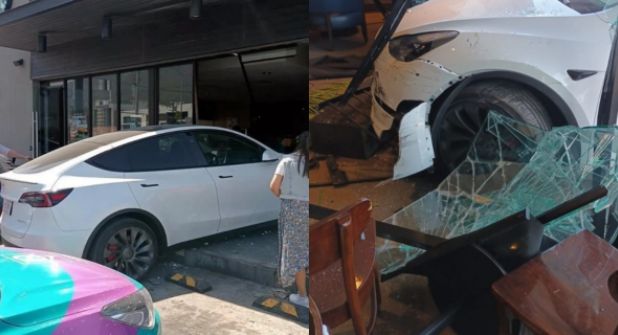 Monterrey.- Por presuntamente confundir los pedales, un hombre de aproximadamente 65 años estrelló su vehículo Tesla contra una cafetería en el municipio de Monterrey.