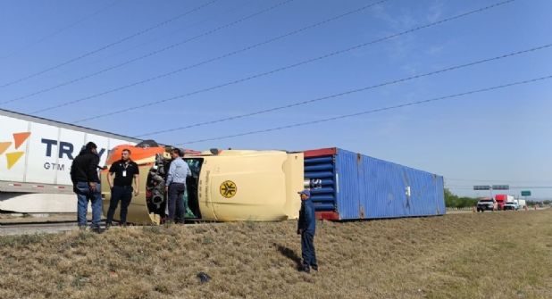 Ciénega de Flores.- Un tráiler que transportaba un contenedor marítimo volcó este martes en la autopista a Laredo, a la altura del kilómetro 30, dentro del Parque Industrial Las Américas, en Ciénega de Flores, Nuevo León.