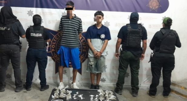 Durante la revisión, se les encontraron 21 dosis de hierba verde con las características similares a la marihuana, 13 dosis de una sustancia con características del cristal, así como dos básculas digitales, todo oculto en una mochila y una bolsa de plástico. Por estos hechos, fueron puestos a disposición del Ministerio Público por delitos contra la salud.