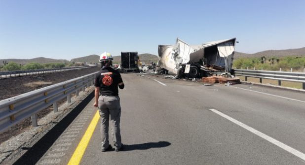 Finalmente, aproximadamente a las 9:00 horas, una colisión de dos tráileres ocasionó un incendio sobre el kilómetro 50 de la autopista a Laredo, las llamas consumieron ambas unidades pesadas, y en una de ellas el operador quedó atrapado y murió calcinado.