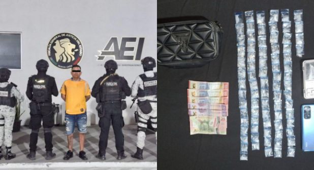 Tras solicitarle detener su marcha, los oficiales le pidieron autorización para revisar sus pertenencias, encontrando en el interior del automóvil un total de 78 dosis de una sustancia con apariencia de cristal, una báscula digital, un teléfono celular y dinero en efectivo.