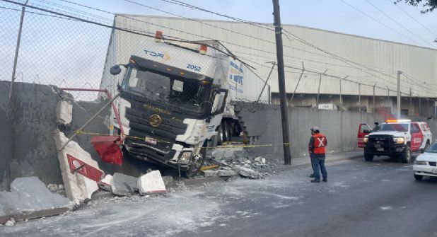 Monterrey.- Un tráiler se estrelló contra la barda perimetral de una empresa de fabricación de cristales, luego de que el freno de mano se desactivara, ocasionando que la pesada unidad avanzará sin control.