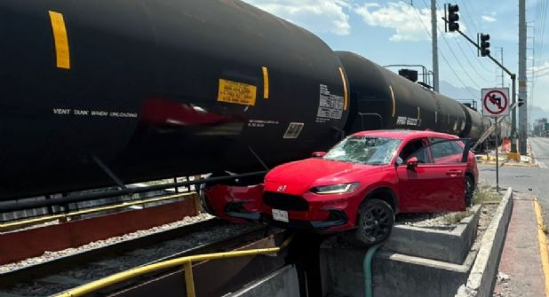 Monterrey. - Dos vehículos fueron arrastrados por el tren en la avenida Gonzalitos, lo que dejó como saldo tres mujeres lesionadas.