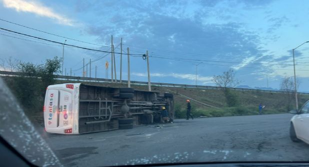 De acuerdo con los informes, la unidad de la empresa “Tenlasa Transporte Inteligente” se dirigía al parque industrial Vynmsa, cuando al momento de que el chofer transitaba por una curva, perdió el control por el exceso de velocidad y terminó volcándose.
