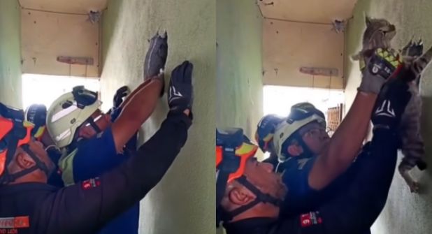 Monterrey.- Un gatito que quedó atrapado entre dos paredes fue rescatado con éxito por elementos de Protección Civil de Nuevo León.