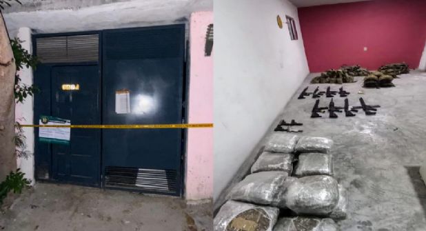 En el sitio, se encontraron fusiles de asalto, municiones, chalecos antibalas con siglas de una organización delictiva y drogas.