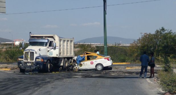 García.- Un accidente se registró en el municipio de García, luego de que un taxi chocara contra un camión tipo torton, perdiendo la vida el chofer del automóvil del servicio público, mientras que el conductor del volteo se dio a la fuga.