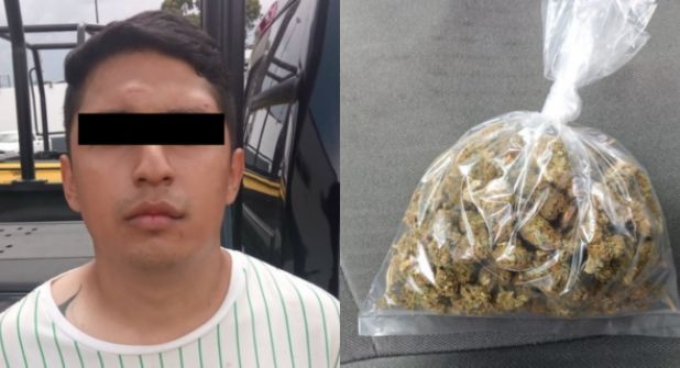 En la revisión corporal, los agentes encontraron entre sus pertenencias una bolsa de plástico con hierba verde seca, presuntamente marihuana. El individuo fue identificado como Erick “N”, de 23 años de edad.