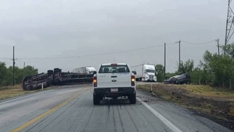Vallecillo. – Un tráiler que transportaba vehículos sufrió una volcadura la mañana de este miércoles en la carretera Monterrey-Nuevo Laredo, a la altura del municipio de Vallecillo, Nuevo León.