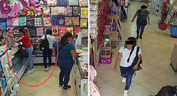 Monterrey. – Una cámara de vigilancia captó cómo una mujer le robó su cartera a otra que estaba comprando productos para fiestas de cumpleaños en una tienda ubicada en el centro de Monterrey.