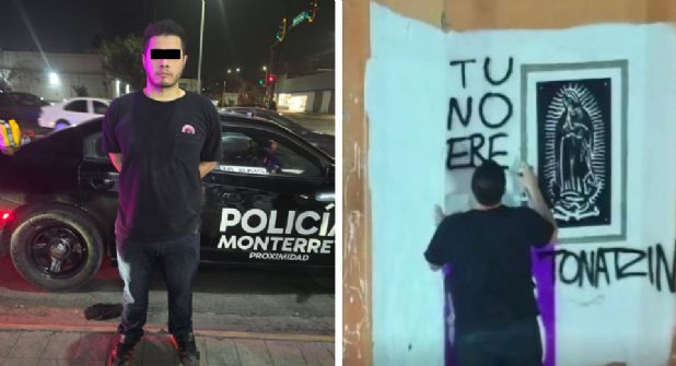 Monterrey.- Un hombre fue detenido luego de realizar un grafiti con aerosol a un costado de una imagen religiosa de la Virgen de Guadalupe pintada en la barda de un local, en el cruce de las calles Cuauhtémoc y Albino Espinoza, en el Centro de Monterrey.