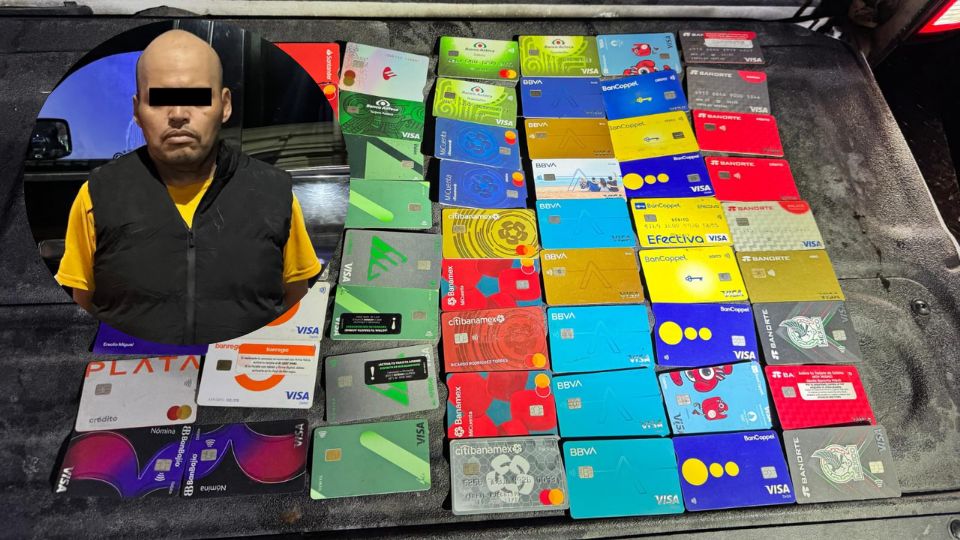 Monterrey. - Un hombre fue detenido por elementos de la Policía de Monterrey tras ser sorprendido en posesión de 57 tarjetas bancarias de diferentes instituciones financieras, mientras se encontraba a bordo de un taxi en el centro de la ciudad.