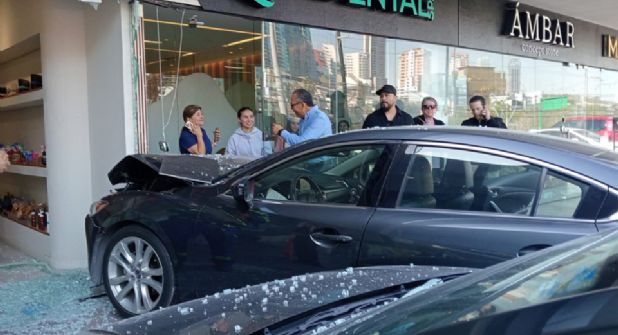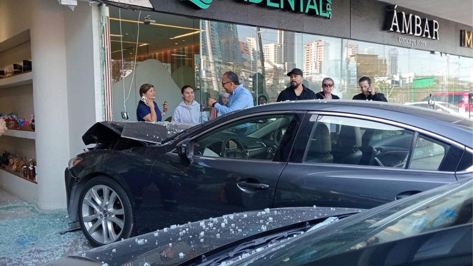 San Pedro Garza García. - Una confusión al momento de maniobrar terminó en un fuerte accidente la mañana de este martes en el municipio de San Pedro, donde una conductora se estrelló contra dos negocios dentro de una plaza comercial tras pisar el acelerador en lugar del freno.