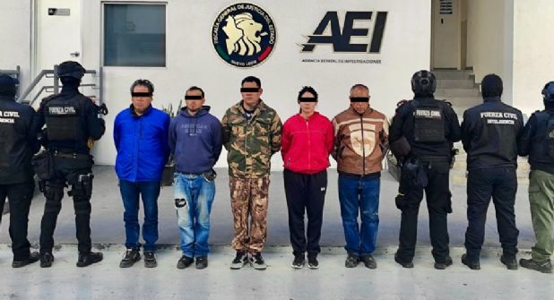 Los detenidos fueron identificados como Mario “N”, de 26 años de edad; Fernando “N”, de 27 años de edad; Irma “N”, de 27 años de edad; Clemente “N”, de 52 años de edad y Fidencio “N”, ambos de 52 años de edad.