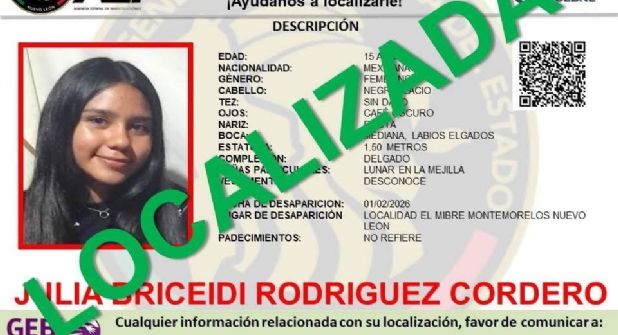 Montemorelos.- Julia Briceidi Rodríguez Castro, de 15 años de edad, fue localizada con vida, reportaron familiares y la Agencia Estatal de Investigaciones (AEI).