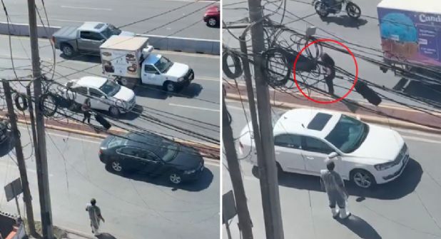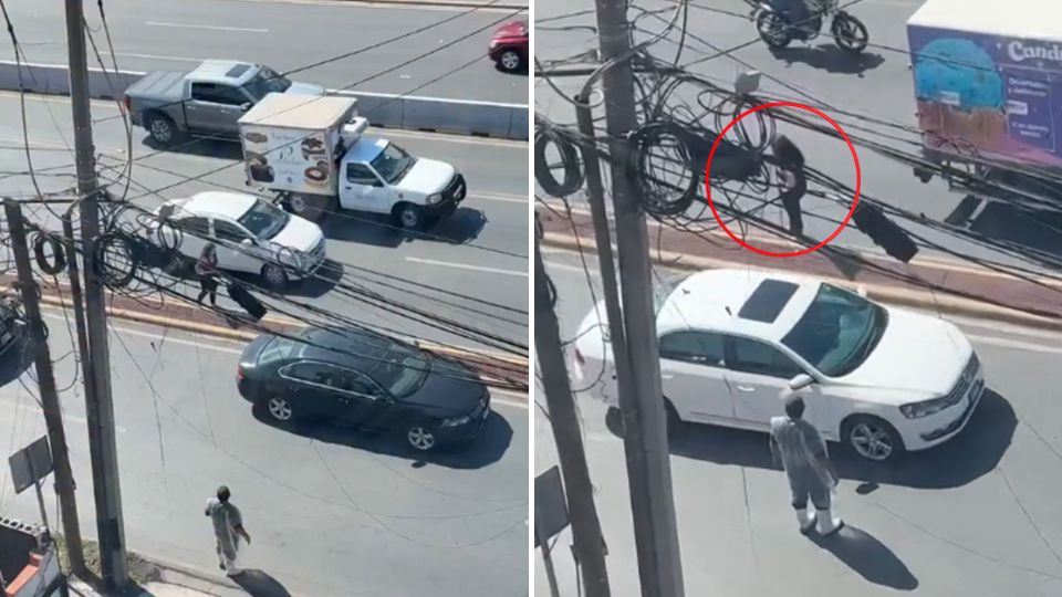 La mujer no estaba sola, ya que del otro lado de la carretera se encontraba un hombre que vestía una indumentaria similar a la de los carniceros, quien se acercó con cautela a ella y le pidió a varios autos que fueran cuidadosos y detuvieran su marcha.