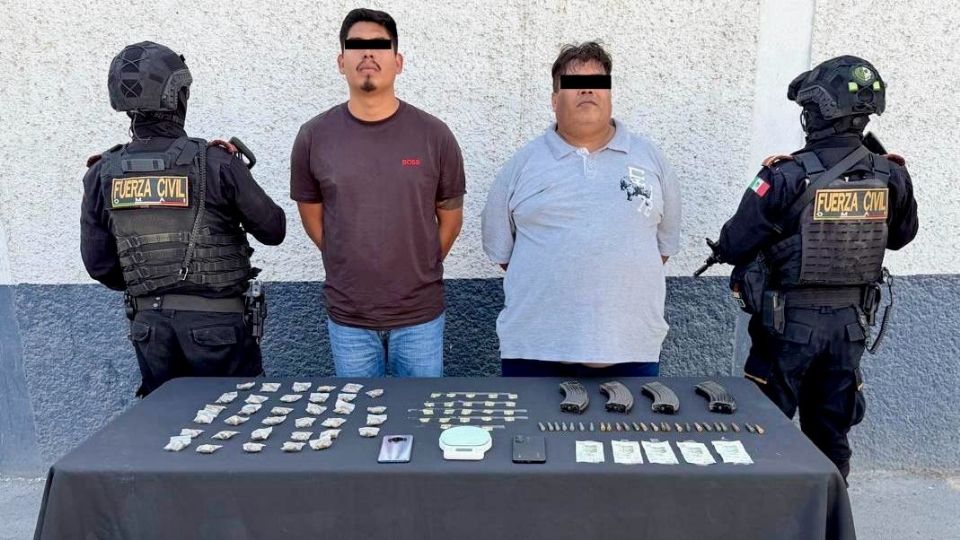 Los detenidos fueron identificados como Jesús “N”, de 28 años, y Carlos “N”, de 47. Durante la revisión, los agentes aseguraron 32 envoltorios con hierba verde y seca con características de la marihuana, 23 dosis de una sustancia sólida blanca similar a la cocaína en piedra, cuatro cargadores de arma larga abastecidos con 25 cartuchos cada uno, además de dinero en efectivo y herramientas de pesaje.