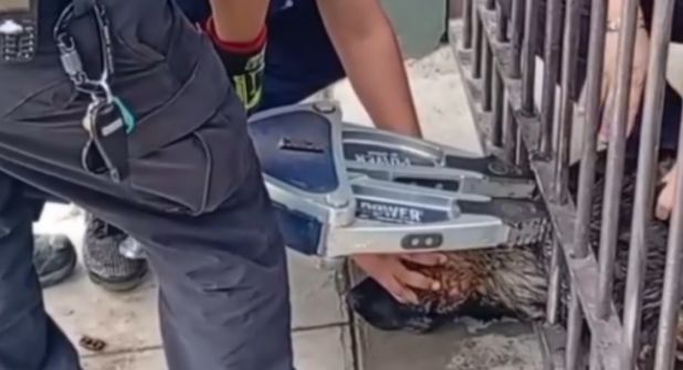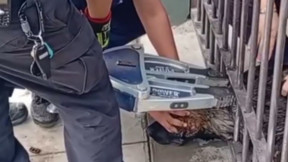 Al cabo de un rato y gracias al uso de herramienta se logró romper las rejas del barandal de forja y, de esta manera, liberar al perrito quien ya se encontraba cansado y muy asustado.