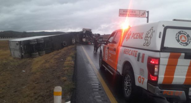 Los rescatistas de Protección Civil del Estado de Nuevo León acudieron al sitio tras recibir el reporte de un accidente aparatoso, encontrando la pesada unidad recostada sobre uno de sus costados a la orilla de la carretera.