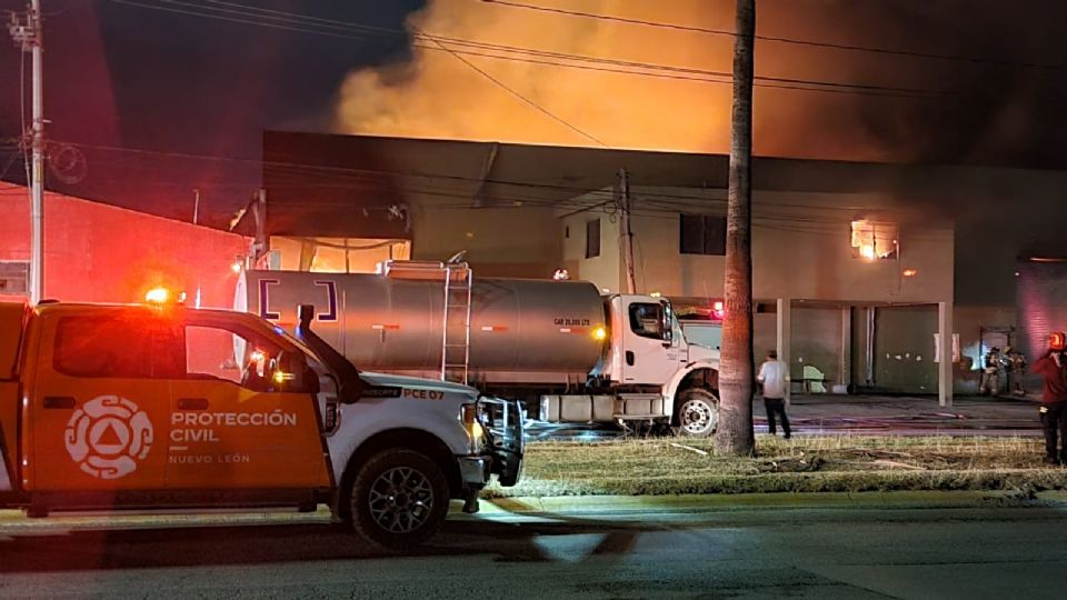 Elementos de Protección Civil de Apodaca y de Pesquería, junto con bomberos de Nuevo León, continuaron con labores de enfriamiento durante más de cinco horas.