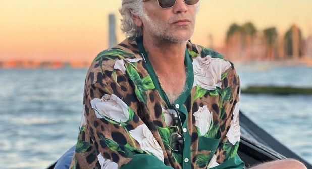 Pero lo que más llamó la atención fue él sobre una góndola luciendo una camisa de gasa floreada, short de color azul y unos aretes dorados, con el aire moviéndole la melena.