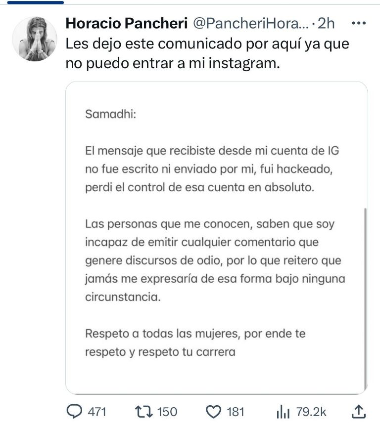 A través de su cuenta oficial de X, anteriormente conocida como Twitter, Horacio Pancheri mencionó que su cuenta de Instagram había sido Hackeada.
